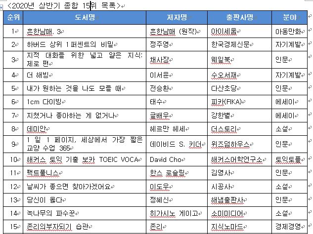 [머니투데이 김고금평 기자] [교보문고, ‘2020년 상반기 베스트셀러’ 발표…초등학습·과학·경영·홈트레이닝↑, 여행·취업↓]