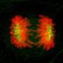 세포 내 미소관(녹색)이 크로모솜(적색)을 양쪽으로 끌어당기고 있다.