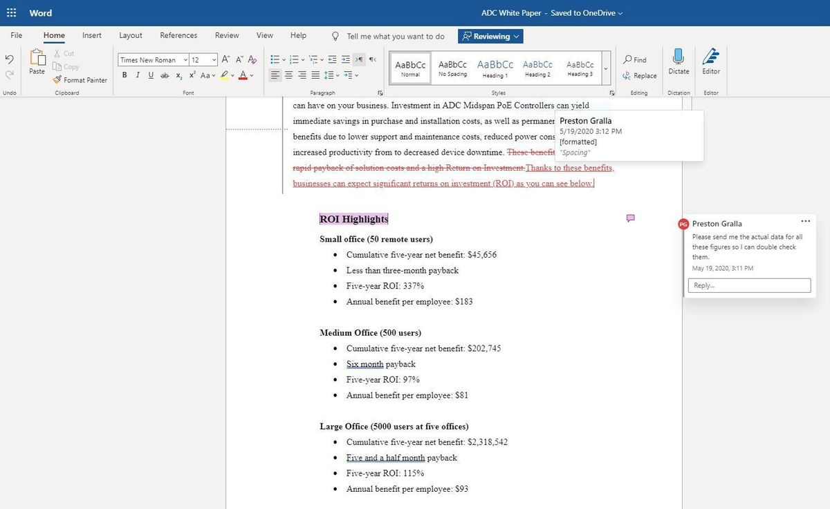하지만 다른 사람과의 협업은 구글 문서가 조금 더 낫다. 워드는 마크업과 메모 기능이 조금 더 나은 편이지만, 실시간 인터넷 기반 협업의 경우에는 구글 문서의 프로세스가 훨씬 더 능률적이다.