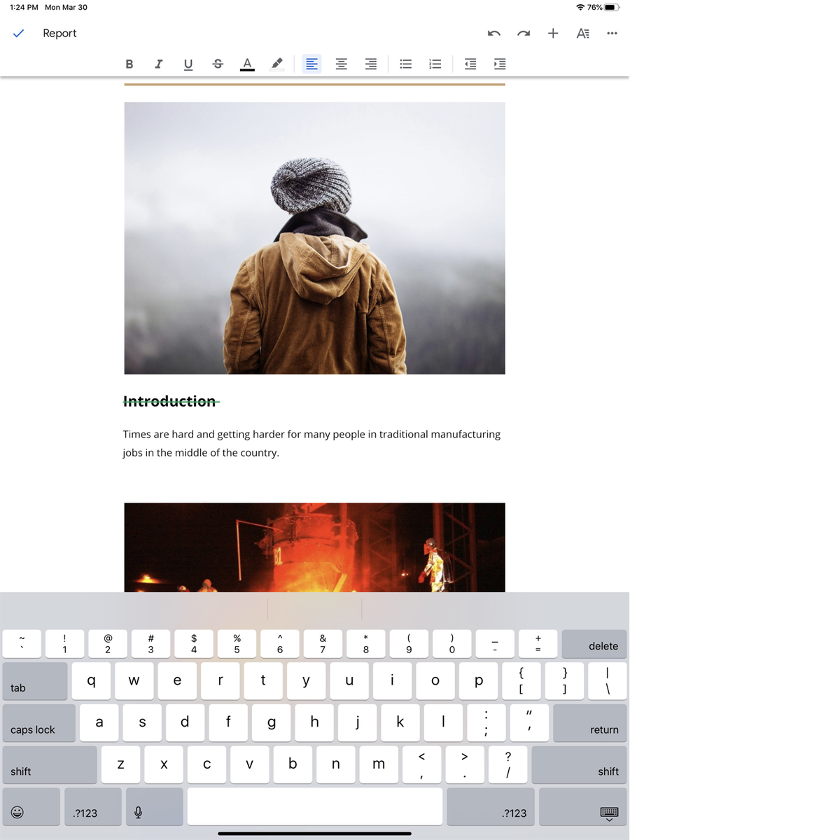 iOS에서는 태블릿과 아이폰 구글 문서 앱이 같다. 그래프와 레이아웃, 차트 등 보고서를 정확히 표시한다. 유일한 차이는 보고서의 첫 페이지 같은 큰 텍스트다. 아이폰 버전에서 일부 텍스트가 2줄이 아닌 3줄로 표시되었다.