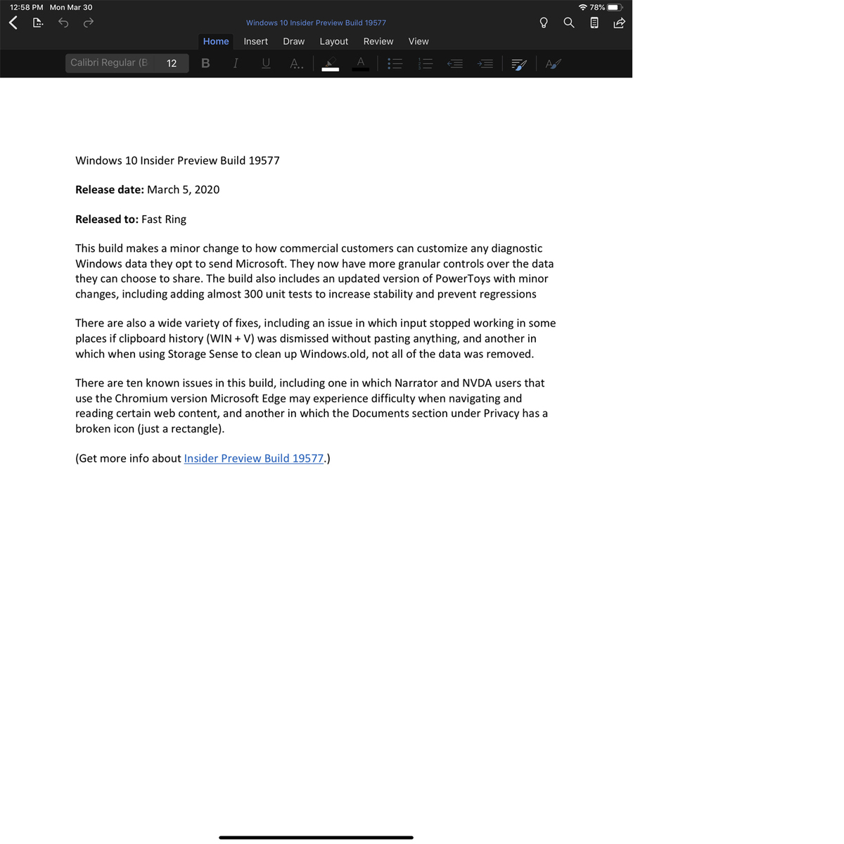 또 아이패드와 아이폰용 워드 버전도 테스트했는데 두 앱 모두 훌륭했다. 특히 윈도우와 맥 버전 레이아웃과 유사한 아이패드 버전이 뛰어났다. 화면 맨 위에는 홈, 삽입, 레이아웃, 검토, 보기의 6개 탭이 있다. 탭 기능도 윈도우 PC나 맥 버전과 유사하다. 그러나 지원되지 않는 기능도 있다. 홈 탭을 예로 들면, 글머리 기호 등 목록을 만들고, 폰트와 폰트 속성을 변경하는 등의 텍스트 처리용 아이콘이 있는데, 단락 스타일 같은 고급 기능은 지원하지 않는다.