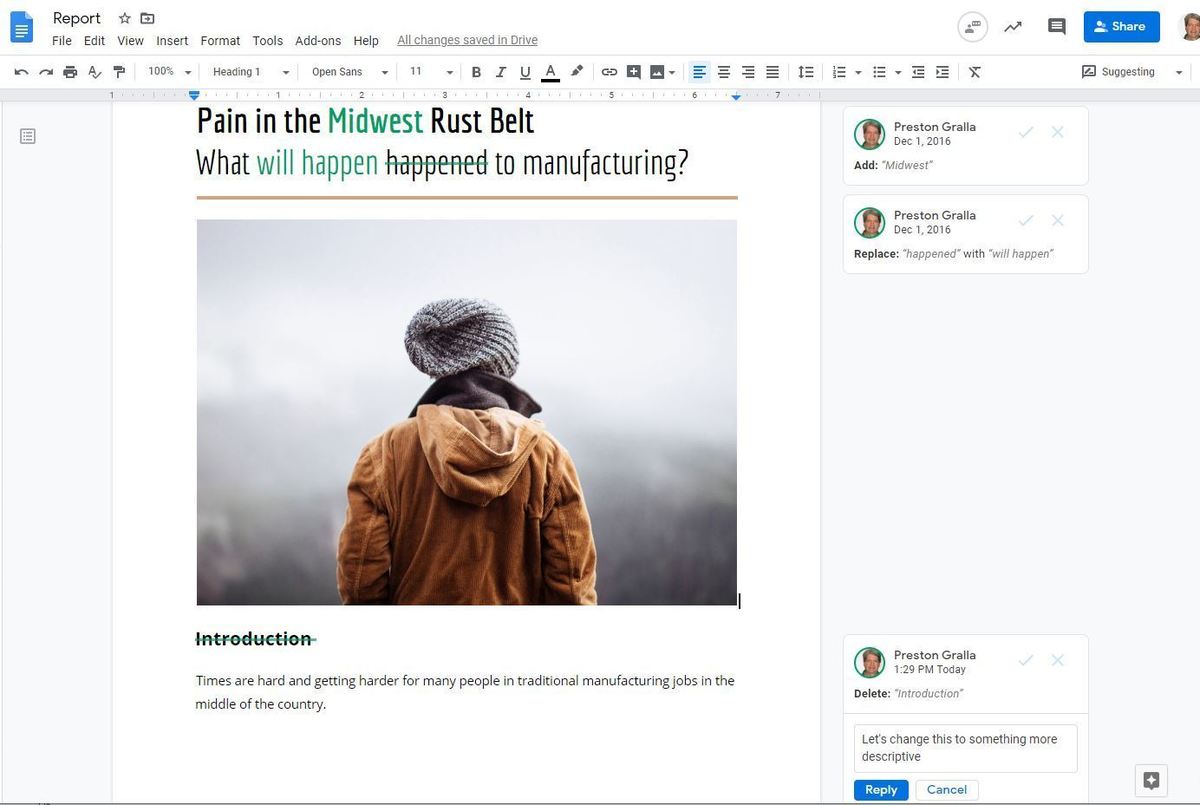 마크업 기능을 사용하려면 화면 오른쪽 위 수정 > 제안을 차례대로 클릭해서 문서를 제안 모드로 바꿔야 한다. 이제 편집 내용이 추적된다. 각 사용자에게 각기 다른 색상이 부여되며, 삭제(문자 가운데의 실선), 추가, 메모가 모두 이 색상으로 표시된다.
