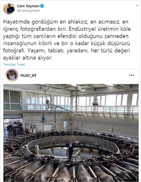 언론인 젬 세이멘은 트위터에 "내가 본 것 중 가장 부도덕하고 잔인하며 역겨운 사진 중 하나"라며 "이는 산업 생산의 노예가 된 오만한 인류의 모습"이라고 말했습니다. 배우 아흐메트 뮌타즈 타이란도 조지 오웰의 소설 '동물농장'의 한 구절인 '모든 동물은 평등하지만, 어떤 동물은 다른 동물보다 더 평등하다'를 인용해 사진을 지적했습니다.