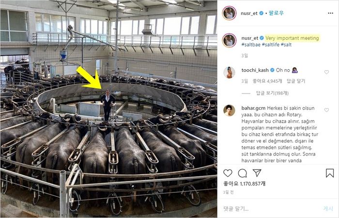 현지 시간으로 지난 10일 터키 유명 스테이크 전문점 '누스르 에트'를 운영하는 누스레트 괵체는 문제의 사진을 자신의 인스타그램에 공개했습니다.
