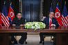 김정은 북한 국무위원장과 도널드 트럼프 미국 대통령이 12일 싱가포르 센토사 섬 카펠라 호텔에서 북미정상회담 공동합의문에 서명 전 소감을 밝히고 있다. (싱가포르통신정보부 제공) 2018.6.12/뉴스1 |