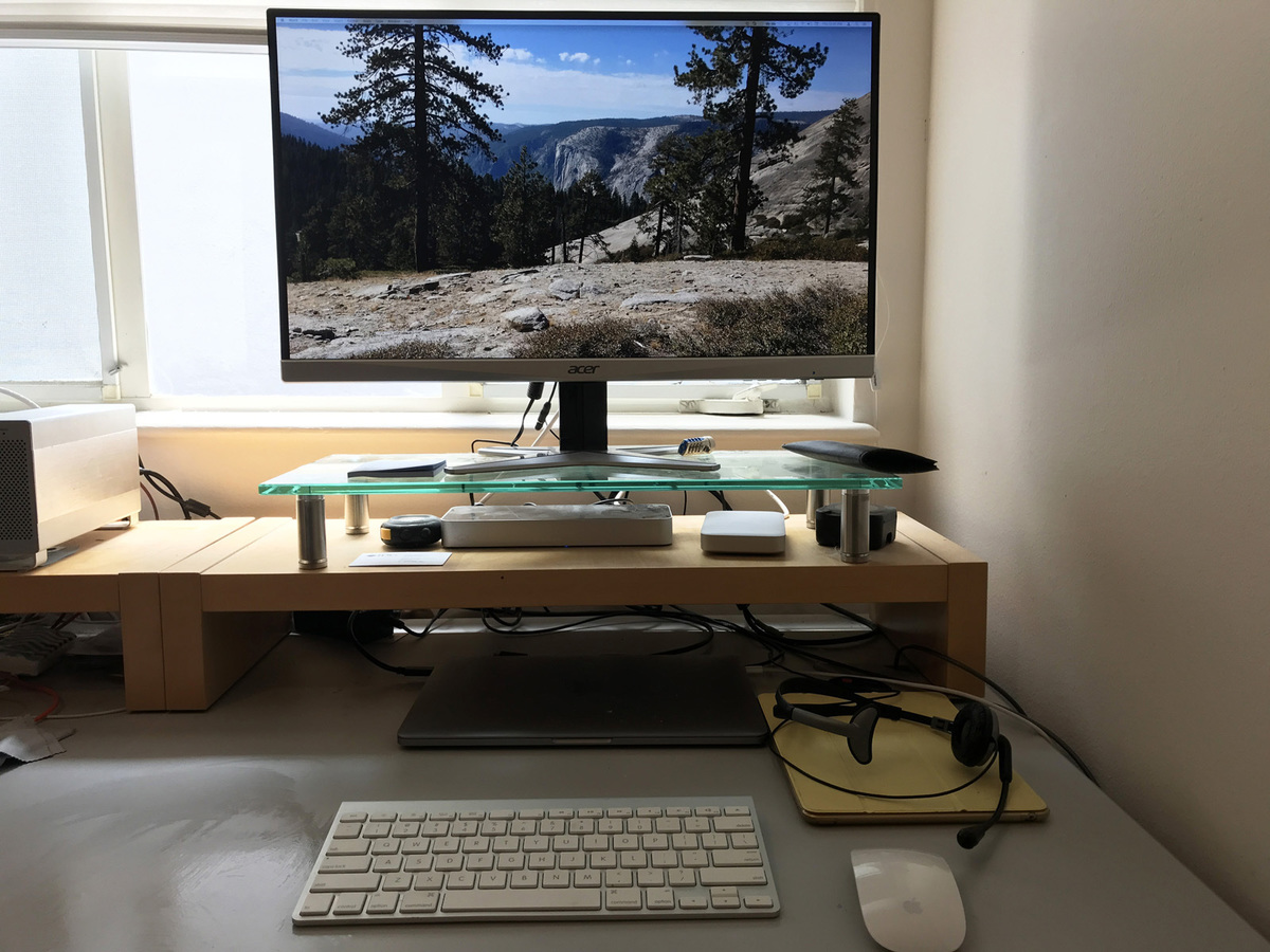 모니터를 적절한 높이에 둘 때 모니터 받침대가 필요할 수도 있다. 필자는 2개를 쓰고 있다. 다른 물건을 놓아두기도 좋다. 높이 조절이 되는 모니터가 도움이 되겠지만, 그 경우에도 받침대가 필요할 수도 있다.