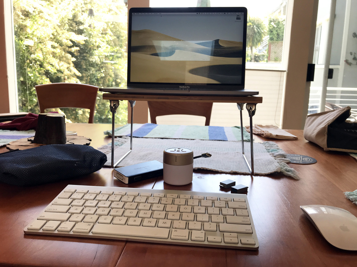 출장을 다닐 때마다 홈 오피스를 가지고 다닐 수는 없다. 그러나 업무 공간을 개선해서 노트북 컴퓨터로도 효율적으로 일하는 방법을 찾을 수는 있을 것이다.접을 수 있는 모니터 스탠드나 베드 테이블, 노트북 스탠드 같은 보조 기기는 집에서도 부엌 테이블 등의 임시 공간에서 일할 때 매우 유용하다. 특히 대형 모니터를 연결해 사용할 수 있는 경우라면 더 그렇다. 출장 시 인체공학적인 업무 공간을 만드는 데 가장 중요한 도구는 접을 수 있는 모니터 스탠드이다. 접을 수 있는 베드 테이블도 마찬가지이다. 접었을 때 너무 두껍지 않은 제품을 구입해야 한다. 여행 가방에 집어넣을 수 있을 정도의 크기를 추천한다.