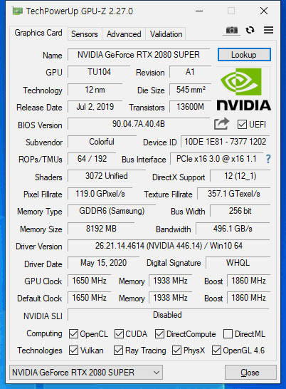 먼저 사양을 확인해 봤다. 컬러풀이 직접 설계한 것으로 3,072개 쿠다 코어와 함께 8GB 용량의 GDDR6 비디오 메모리가 탑재됐다. 기본 작동속도는 엔비디아 기본인 1,605MHz지만 최대 작동속도가 1,860MHz로 설정되어 있다. 엔비디아 기본형은 1,815MHz로 45MHz 오버클럭 되어 있다.