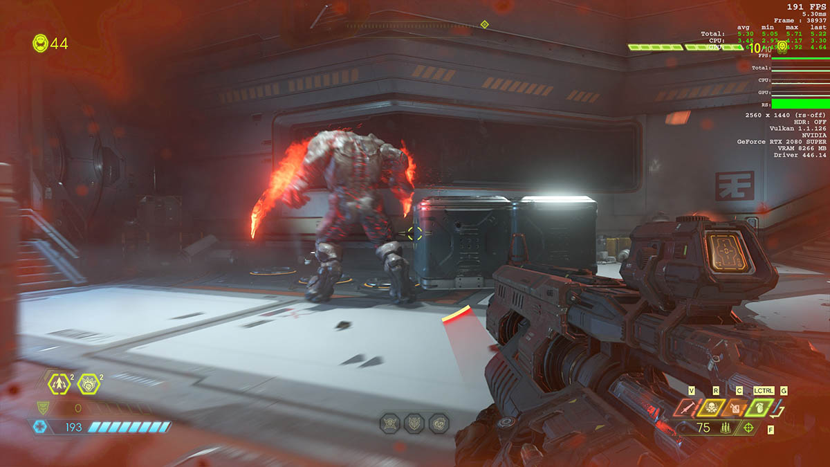 실제 게임 내에서의 속도를 확인해 볼 차례. 실행한 게임은 둠 이터널(DOOM Eternal)이다. 그래픽 효과를 모두 최대로 설정한 다음, 게임을 실행했다. 해상도는 QHD(2,560 x 1,440)에 맞춘 상태.