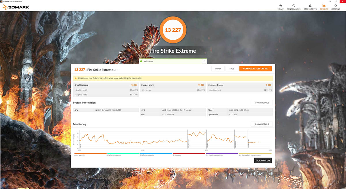 이번에는 파이어 스트라이크 익스트림. 해상도가 높아지면서 처리할 데이터 수가 늘어나니 성능은 전반적으로 떨어지게 된다. 점수는 우선 1만 3,964점. 두 번에 걸쳐 진행되는 그래픽 테스트 결과는 각각 초당 75매(75.85프레임)와 50매(50.61프레임)를 기록했다. 수치 자체는 낮아 보여도 실제 게임 내에서의 성능이 아니므로 참고만 하자. 앞서 언급한 것처럼 벤치마크 소프트웨어는 그래픽카드에 부하를 주는 효과를 다수 적용하기 때문이다.