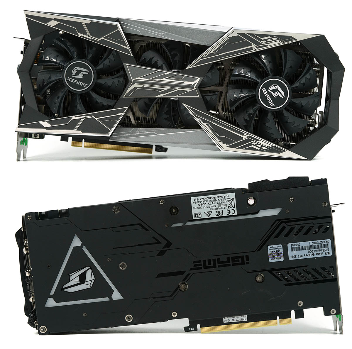 컬러풀 아이게임 지포스 RTX 2080 슈퍼 벌칸 X는 크기부터 시선을 압도한다. 320mm에 가까운 긴 길이지만 자연스레 성능에 대한 기대감을 갖게 해준다. 아무래도 큼직한 냉각 장치(방열판 + 냉각팬)을 제공하는데다 여유로운 기판 면적 안에 부품을 집적할 수 있어서다. 이는 발열 제어에 어느 정도 영향을 준다. 냉각팬은 3개로 모두 지름 90mm 사양이다.전반적인 외모를 강한 직선 위주로 꾸몄다. X자 형태의 덮개를 중심으로 기계 느낌을 주는 선들이 그 안에 그려져 있다. 겉으로 보이는 화려함이 아닌 멋과 실리를 추구하려는 듯한 인상을 준다.