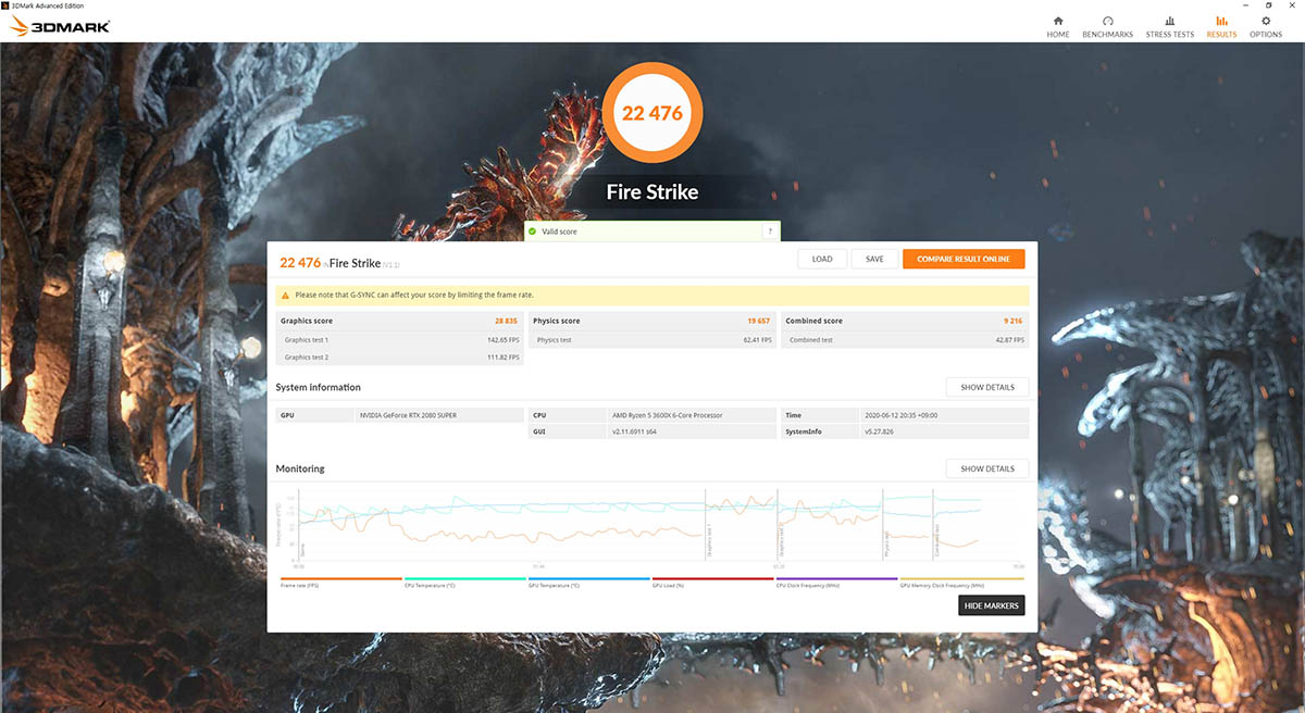 파이어 스트라이크 측정 항목을 먼저 살펴봤다. 그래픽 처리에 따른 점수는 2만 8,835. 두 번에 걸쳐 진행된 그래픽 테스트에서의 초당 이미지 처리 수는 각각 초당 142매(142.65프레임)와 111매(111.82프레임)다. 이 정도 성능이라면 풀HD 해상도 내에서 성능 저하를 걱정하지 않아도 될 듯하다.