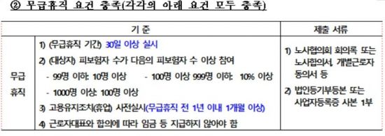 매출 감소, 노사 합의…무급휴직 지원 요건은?지원금을 받으려면 ▲고용조정이 불가피하게 된 사업주가 ▲법령상 무급휴직 요건을 갖춰야 한다. 고용조정 불가피성을 판단하기 위해 재고량 전년 대비 50% 이상 증가, 매출액·생산량 30% 이상 감소 등을 보여주는 증빙서류가 필요하다.