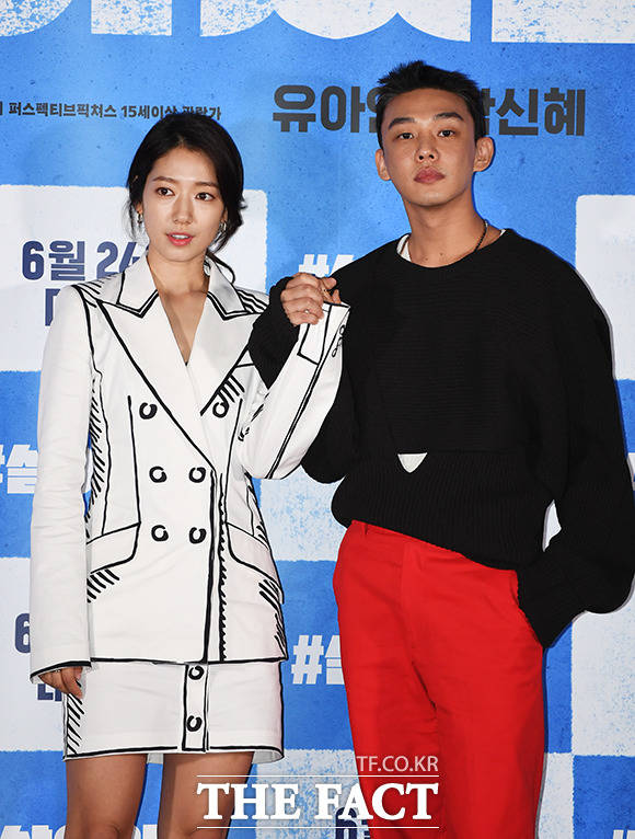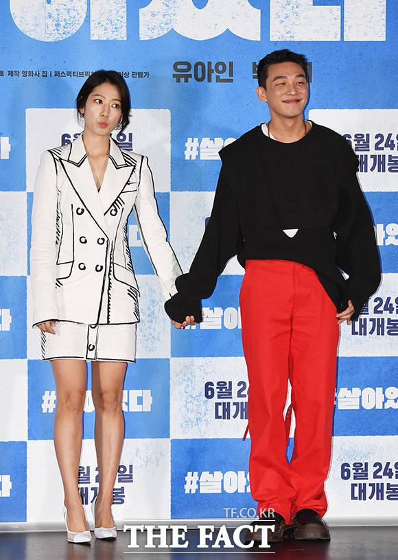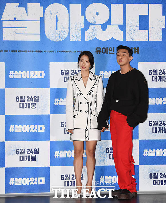 [더팩트ㅣ배정한 기자] 배우 박신혜(왼쪽)와 유아인이 15일 오후 서울 광진구 롯데시네마 건대입구점에서 열린 영화 '#살아있다' 언론시사회에 참석해 포토타임을 갖고 있다. '#살아있다'는 원인불명 증세의 사람들이 공격을 시작하며 도시가 통제 불능에 빠진 가운데 아파트에 홀로 고립된 준우(유아인 분)와 유빈(박신혜 분)의 이야기를 그린 생존 스릴러로 오는 24일 개봉된다.