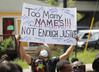 미국 조지아주 애틀랜타 경찰청 앞에서 14일 흑인 남성 레이샤드 브룩스가 경찰의 총에 맞아 사망한 것에 항의하기 위해 열린 시위에서 한 남성이 그동안 경찰의 과잉진압 도중 숨진 수많은 이들의 이름과 함께 ‘너무나 많은 이들이 희생됐으나 여전히 정의는 실현되지 않았다’고 적힌 펼침막을 들고 있다. 애틀랜타/EPA 연합뉴스 |