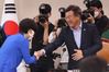 윤호중 법사위원장과 백혜련 더불어민주당 법사위 간사가 16일 국회 법제사법위원회에서 열린 첫 전체회의에서 악수를 하고 있다. [뉴스1] |