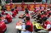 [서울=뉴스핌] 이한결 기자 = 18일 오후 서울 여의도 더불어민주당사 앞에서 열린 ‘250억 임금체불 처벌! 운항 즉각 재개! 구조조정 중단! 이스타항공노동자 4차 총력결의대회’에서 참가자들이 손 팻말을 들고 있다. 이날 이스타항공조종사노동조합은 이스타항공의 창업주이자 사실상 소유주인 이상직 더불어민주당 의원을 규탄하며 체불임금 해결을 촉구했다. 2020.06.18 alwaysame@newspim.com