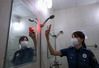 서울 성북경찰서 여성청소년과 직원이 국민대 한 건물 샤워실에서 스마트폰과 불법 촬영 점검카드를 이용해 불법카메라를 찾아내는 시연을 하고 있다./연합뉴스 |