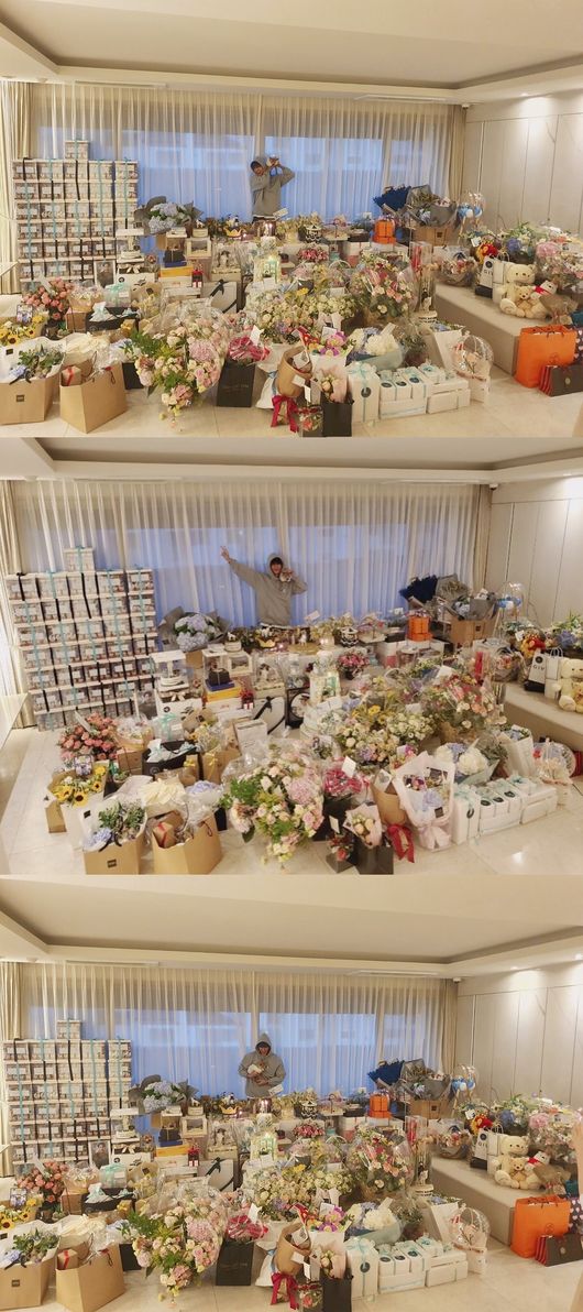 사진 속에서 이민호는 대형 거실을 가득 채운 선물들을 인증하고 있다. 꽃부터 선물, 케이크까지 엄청난 양이 ‘한류스타의 위엄’을 보여주고 있다.