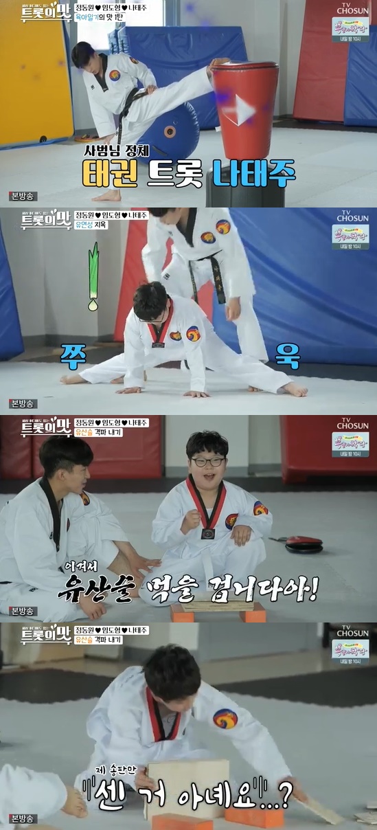 정동원, 임도형은 태권도를 배우기 위해 나태주를 찾아갔다. 나태주는 태권도 경력을 물었고, 정동원은 "파란 띠다"라고 밝혔다. 임도형은 "1품까지 땄다. 집에 품증도 있다"라며 밝혔다. 거친 몸풀기 후 다리 찢는 시간. 임도형은 유연성을 뽐냈지만, 정동원은 힘들어했다. 이어 유산슬 격파 내기. 임도형이 1개 성공하자 정동원은 "이게 격파인가요?"라며 도발했다. 하지만 정동원은 1개도 성공하지 못했다.