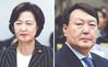 ![추미애 법무부 장관이 25일 ‘민주당 초선 의원 혁신포럼’에 참석해 국민의례를 하고 있다. 오른쪽 사진은 지난해 말 대검 국정감사장에서 개회를 기다리는 윤석열 검찰총장. [뉴시스·연합뉴스]](http://static.news.zumst.com/images/2/2020/06/26/6f4c381c08ea4cce8dc76f908e913402.jpg)