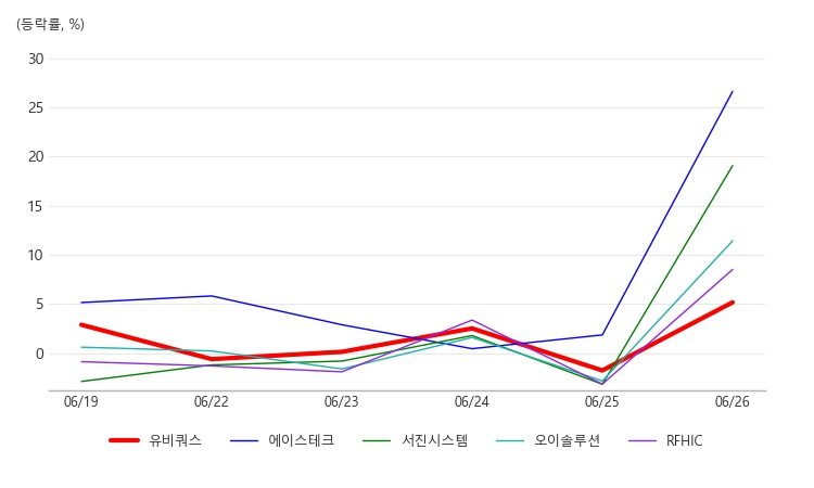 26일 5G(5세대 이동통신) 테마가 전일 대비 5.03% 상승하면서 강세를 보이는 가운데 관련주로 주목받고 있는 유비쿼스가 전일 대비 5.47% 상승하며 급등하고 있다. 유비쿼스는 유선 통신장비 제조업체로 알려져 있다.