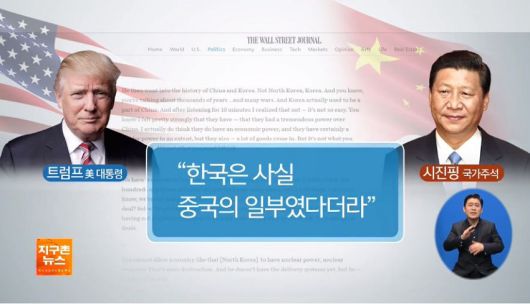 도널드 트럼프 미국 대통령은 2017년 월스트리트저널(WSJ)과 인터뷰 하면서 시진핑 중국 주석으로 부터 "한국이 사실 중국의 일부였다고 들었다"고 발언해 파문이 일었다. 해당 발언에 대한 한국 외교부의 항의에 중국 당국은 "한국 국민이 걱정할게 없다"고 만 말하며 해당 발언에 대해선 긍정도 부정도 하지 않았다./사진=유튜브 캡처 |