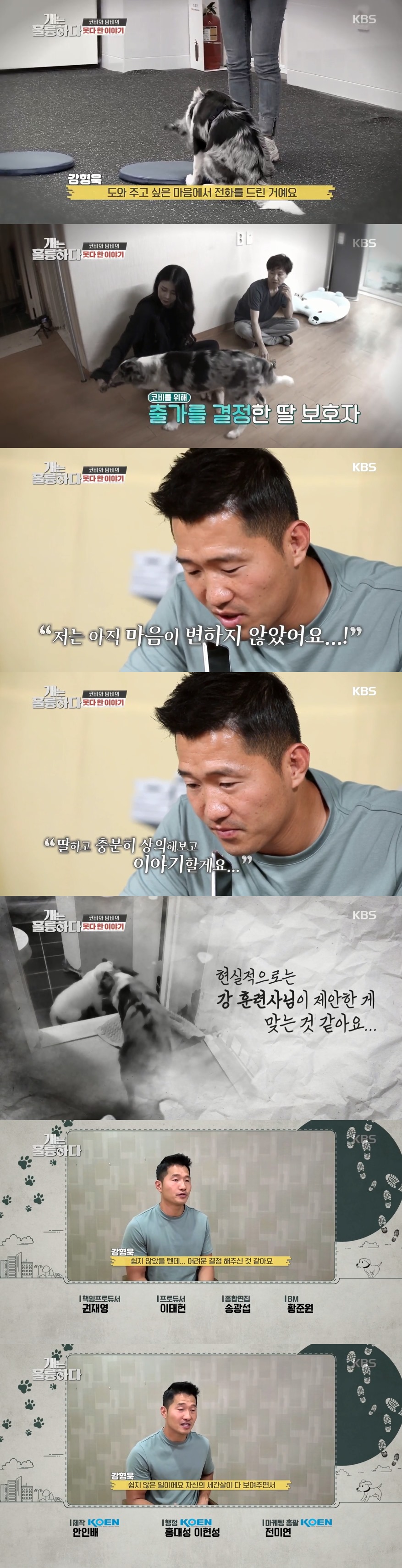 강형욱은 "어머니 속이 얼마나 상하겠느냐. 우리가 도와줄 수 있는 게 있다면 돕고 싶다"며 "저는 훈련사니까 다른 건 모르겠고 코비 교육에 도움을 드리고 싶다"고 도움에 대한 의지를 내비쳤다. 딸 보호자는 "제가 코비를 데리고 나가서 사는 게 맞는 것 같다"며 출가 계획을 밝혔다.