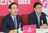 미래통합당 주호영 원내대표가 5일 국회에서 열린 현안 간담회에서 국정조사 추진ㆍ인사청문·상임위 보임계 제출 등 국회 복귀 구상에 대해 답변하고 있다. 오른쪽은 김성원 원내수석부대표. 연합뉴스 |