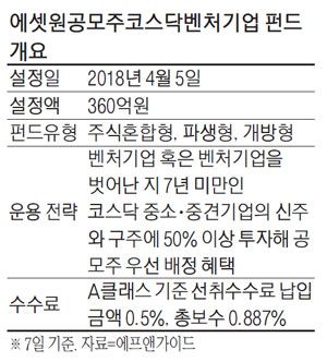 7일 펀드평가사 에프앤가이드에 따르면 에셋원공모주코스닥벤처기업 펀드는 지난 2년간 수익률 27.77%를 기록해 코스닥벤처펀드로는 독보적인 성과를 올렸다. 이 펀드는 공모주 투자를 적극 활용하는 동시에 선물을 활용해 변동성을 줄이는 차별화된 전략으로 1개월 4.45%, 3개월 20%, 연초 이후 17.58%라는 높은 수익률을 기록 중이다. 에셋원자산운용은 특히 정부 요구사항인 50% 벤처기업 투자에 있어서 선물 매도를 활용한 롱숏 기법을 통해 해당 투자 수익률을 0%로 맞추는 전략을 활용해 손실을 최소화한 것으로 알려졌다. 선물 거래를 활용해 코스닥 급등락에 따른 영향을 줄여 안정성을 높였다는 평가다.