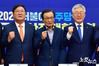8일 국회에서 열린 더불어민주당 경기도 예산정책협의회에서 김태년 원내대표, 이해찬 대표, 이재명 경기도 지사가 기념촬영을 하고 있다.
