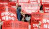 8일 오후 서울 마포구 애경그룹 본사 앞에서 열린 이스타항공노동자 7차 결의대회에서 참가자들이 구호를 외치고 있다.