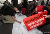 [서울=뉴스핌] 정일구 기자 = 8일 오후 서울 마포구 애경그룹 본사 앞에서 열린 이스타항공노동자 7차 결의대회에서 참가자들이 제주항공의 이스타항공 인수를 촉구하는 메시지를 작성하고 있다. 2020.07.08 mironj19@newspim.com