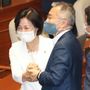 추미애 법무부 장관과 최강욱 열린민주당 대표가 지난 3일 오후 국회 본회의가 끝난 뒤 인사하고 있다. 연합뉴스 |