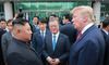 지난 2019년 6월 진행된 남북미 판문점 회동에서 이야기를 나누는 문재인 대통령(가운데), 트럼프 미국 대통령(오른쪽), 김정은 위원장. 연합뉴스 |