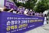 여성단체 회원들이 지난 7일 서울 서초구 서울고법 앞에서 아동 성착취물 사이트를 운영한 손정우씨에 대한 미국 송환을 거부한 재판부를 규탄하는 기자회견을 열고 있다. 2020.7.7 뉴스1 |