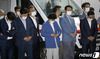 박홍근 더불어민주당 의원(앞줄 오른쪽부터), 이학영 의원, 남인순 의원이 10일이 새벽 서울 종로구 서울대병원에서 침통한 표정으로 박원순 서울시장 운구차를 기다리고 있다. 박 시장은 가족의 실종신고 후 7시간 여에 걸친 수색 끝에 삼청각 인근 산 속에서 싸늘한 주검으로 발견됐다. 2020.7.10/사진=뉴스1 |