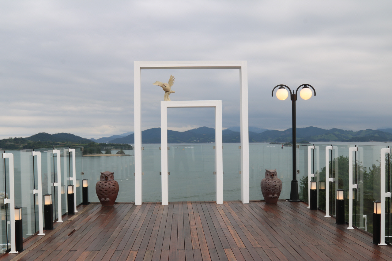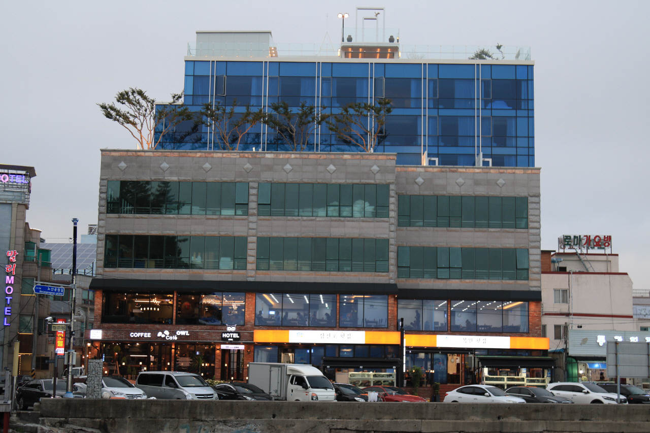 김정인 교수는 "외부는 파벽(빨간벽돌)을 쓰며, 2층라인을 연결시켰다. 2층은 커피숍과 횟집을 연결 했는데 파벽 벽돌이 저녁때 불을 켜놓으면 고성 같다. 삼천포 부엉이 호텔 루프탑은 싱그러움이 다르다. 바다 조망권 이 최고인데, 룸안에서 보는 조망권도 좋다"고 말했다.