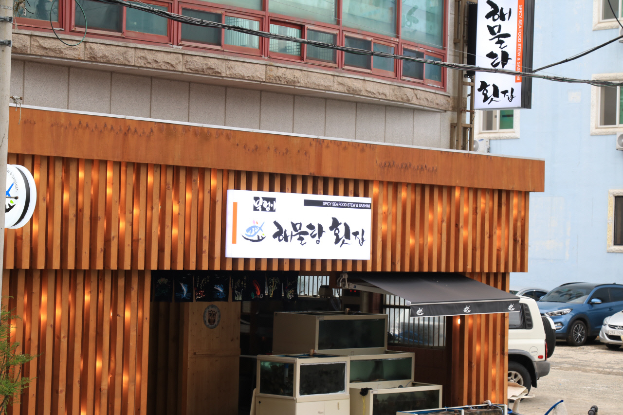 팔포음식특화지구엔 식당가가 많다. 부엉이호텔 후문을 나오면 부엉이 해물탕 횟집(바다향기횟집)이 보이는데 시원한 쟁반물회가 일품이다.