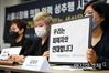 김혜정 한국성폭력상담소 부소장이 13일 서울 은평구 한국여성의전화에서 열린 서울시장에 의한 위력 성추행 사건 기자회견에서 '우리는 피해자와 연대합니다' 문구가 적힌 손팻말을 들고 있다./사진=문호남 기자 munonam@ |
