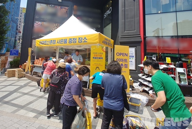 이날 이마트는 1년 7개월 만의 신규 점포인 신촌점을 개점했다. 옛 그랜드마트가 있던 그랜드플라자 건물 지하 1층~지하 3층 자리다. 신촌 지역의 20∼30대 인구 비중이 40%에 달하고, 1~2인 가구가 많은 점을 고려해 소포장 식품 관련 기획상품(MD) 중심으로 매장을 구성했다는 게 이마트의 설명이다.