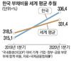 19일 국제금융협회(IIF)의 '글로벌 부채 모니터 보고서'에 따르면 올해 1분기 GDP 대비 한국의 가계·기업·정부·금융 부문 부채비율은 336.4%로 지난해 1분기(315.1%)에 비해 1년 새 21.3%포인트 급증했다.