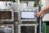 마이크로버블 장비를 들여다보고 있는 생기원 연구팀 |