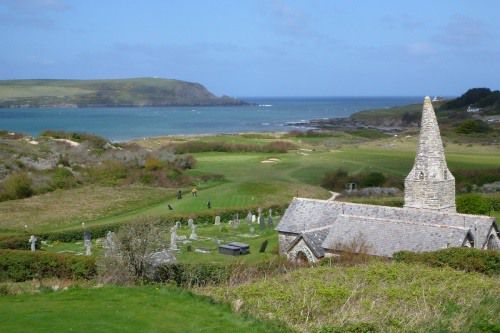 세인트 에노독 교회와 교회 묘지 뒷편으로 파3 11번 홀의 그린과 데이머 만의 바다가 보인다. |
