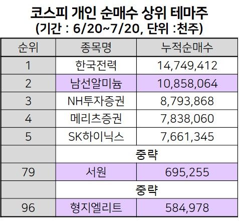 이낙연 의원 테마주로 분류돼 온 남선알미늄은 최근 한달새 개인 순매수가 가장 많이 몰린 정치인 테마주다. 지난달 20일부터 이달 20일까지 누적순매수 수량은 108억5806만주 규모로, 코스피 전체 종목 가운데 한국전력에 이어 두번째로 많은 규모다. 최근 한달새 거래된 물량만 3053억주 가량이다. 또다른 이낙연 테마주 서원은 같은 기간 개인 순매수 6억9525만주 규모를 기록해 테마주 가운데 눈에 띄는 매수세를 보였다.