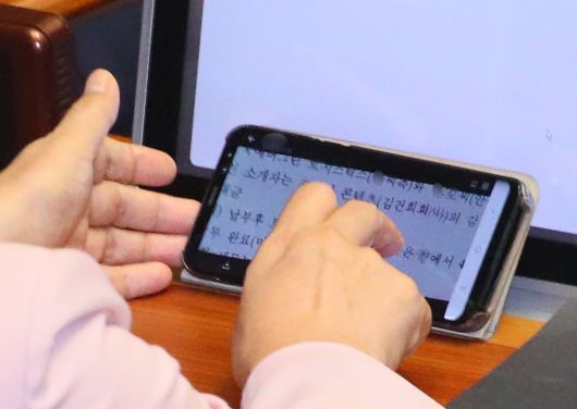 추 장관은 이날 국회 본회의장에 앉아 스마트폰으로 ‘토지 매각 추진 및 대출금에 대한 연체 발생’ 등의 제목 아래 김건희씨의 회사와 관련된 내용이 담긴 자료를 읽었다.