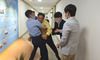 경기 고양시의회 이길용 의장이 22일 고양시청 2층 시장실앞에서 소동을 벌이고 있다. 뉴시스 |