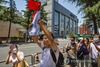 27일 청두 미 영사관 앞에서 한 남성이 친중국 구호를 외치고 있다. [EPA=연합뉴스] |