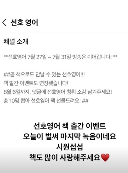 이 가운데 하선호는 27일 인스타그램 스토리를 통해 "선호 영어 7월 27일~7월 31일 방송은 쉬어갑니다!"라는 공지 글을 게재했다. 이와 함께 "선호영어 책 출간 이벤트 오늘이 벌써 마지막 녹음이네요 시원섭섭 책도 많이 사랑해주세요♥"라는 홍보 글을 덧붙였다.