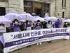 참석자들이 보라색 우산을 펼쳐든 채 집회를 진행하고 있다./사진=이정현 기자 |